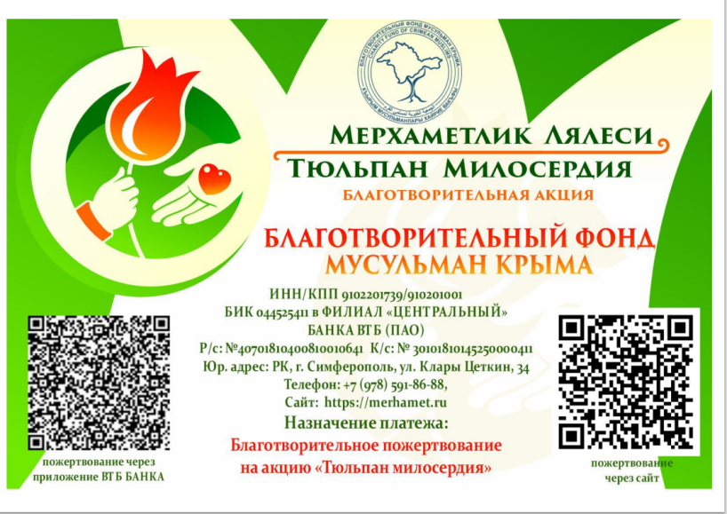 Благотворительная акция «Мерхаметлик лялеси» («Тюльпан милосердия»), инициирована Духовным управлением мусульман Крыма и города Севастополь, учреждена духовным лидером мусульман Крыма и города Севастополь хаджи Эмирали Аблаевым в 2020 году. Основная цель акции – оказание помощи тяжелобольным детям и их семьям. Девиз акции «Тюльпан милосердия», девиз которой «Добро руками детей и добрыми помыслами взрослых». Тюльпан — одни из самых популярных цветов весны, которые радуют глаз своей яркой палитрой и лаконичной формой. Эти цветы считаются символом обновления, чистоты чувств, искренней радости и надежды.Тюльпан- этокультурный символ мусульманского мира и символ милосердия.Сроки проведения: с 28 октября 2025 по 30 апреля 2026 года. Присоединяйтесь к акции! Вместе мы можем сделать мир добрее!